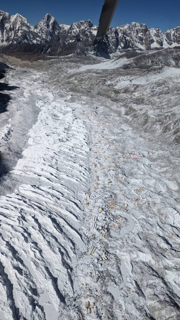 Then we flew over base camp, and I was totally surprised by how busy it was. My thought coming in was that it would be 50-100 tents huddled together where trekkers stayed to acclimate and decide if they really wanted to undertake this beast, even though it sounded like a great idea in their hometown pub. No, no, the base camp is approx. a half mile in length, and 300 ft. or so in width. There were hundreds of tents and even some structures. Was kinda of a high altitude city really.